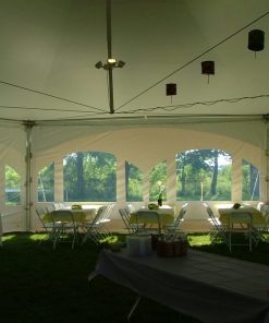 This 40′ hexagon marquee tent is the most unique and beautiful tent that we carry! It measures 40′ from each corner to corner, 35′ from each side to side, and has no poles in the middle. Each side has a full 20′ opening with no poles in between and is 9′ tall at the openings. The 40′ hexagon marquee tent has a total square footage of 1023 square feet and a peak height of 22’2″. Our 20’x20′ marquee canopies can be attached to this tent for even more space! This tent requires an open area of at least 50’x50′ of grass or dirt to be staked.