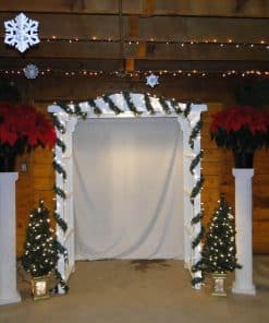 This white wood rectangular arch radiates classic elegance, providing versatility to accommodate any special occasion. It measures 92″ tall x 72″ wide x 30″ deep and can conveniently disassemble into three pieces for simple transportation. Ideal for personalizing to complement your distinct style.